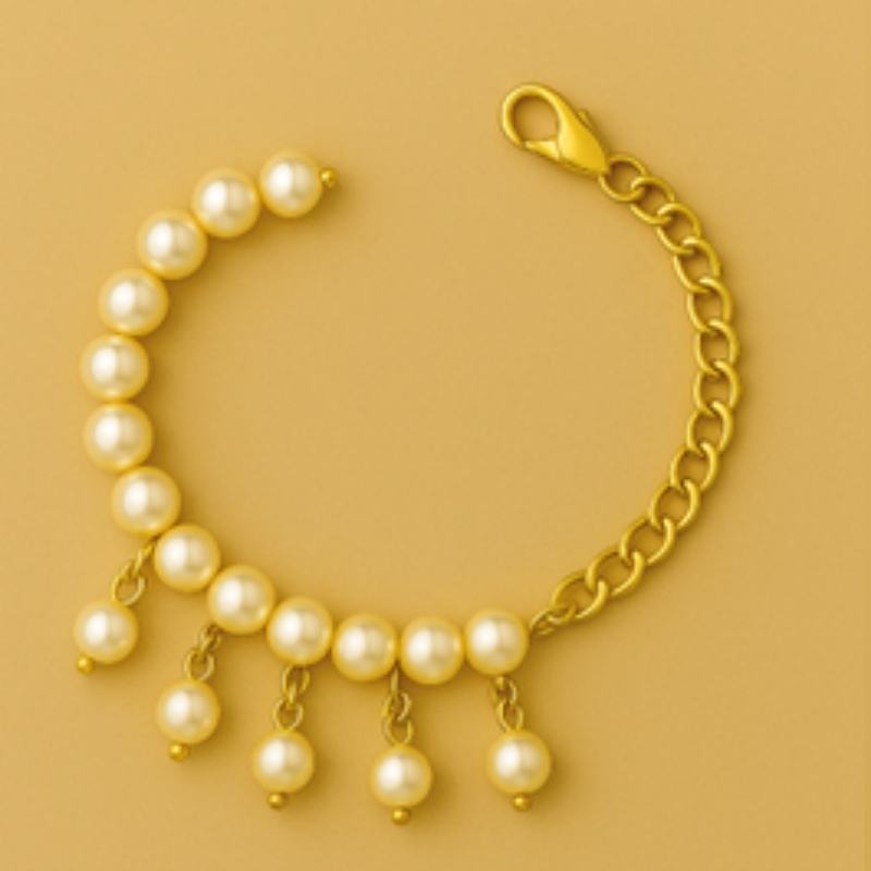 Description: Half-open pearl bracelet with drop charms and chain link.