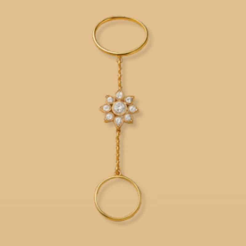 Description: Delicate dual finger haathphool with floral motif and chain links